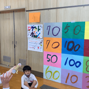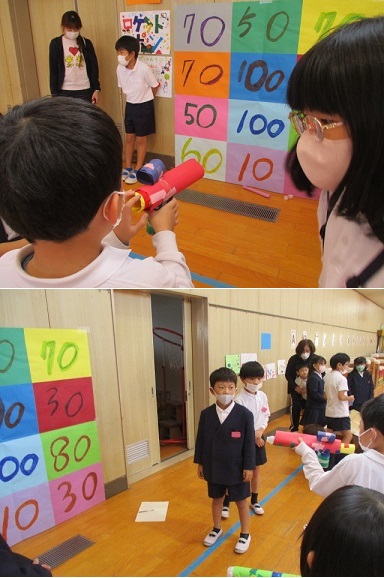 同じく、生活科「おもちゃランド」の2年生と1年生の交流の様子です。1年生は時間制で5つのコーナーを回って楽しみました。