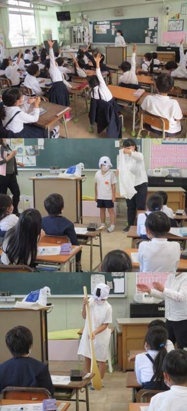 調理員さんに変身する体験では、調理服を着たり、実際に使っている道具を持ったりしました。