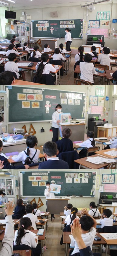 11月14日(月)1年生が食に関する指導で「きゅうしょくしつをたんけんしよう」の学習をしていました。