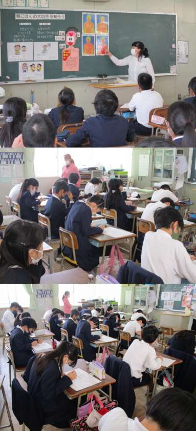 5年生が食に関する指導で、「朝ごはんの大切さを知ろう」を行っていました。朝ごはんを食べると3つのよい働きがあることを知り、朝ごはんの大切さを知ることができました。