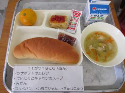 本日は、ツナポテトオムレツです。卵、ツナ、じゃがいもが入っています。バターをかけて焼き物機で蒸し焼きにします。喫食時にケチャップをかけていただきます。給食室で、「これは何?」と聞かれて、「ツナポテトオムレツだよ。」と言うと、「よっしゃーーーーーー!」と大喜びのガッツポーズでした。