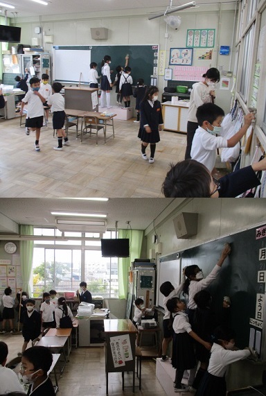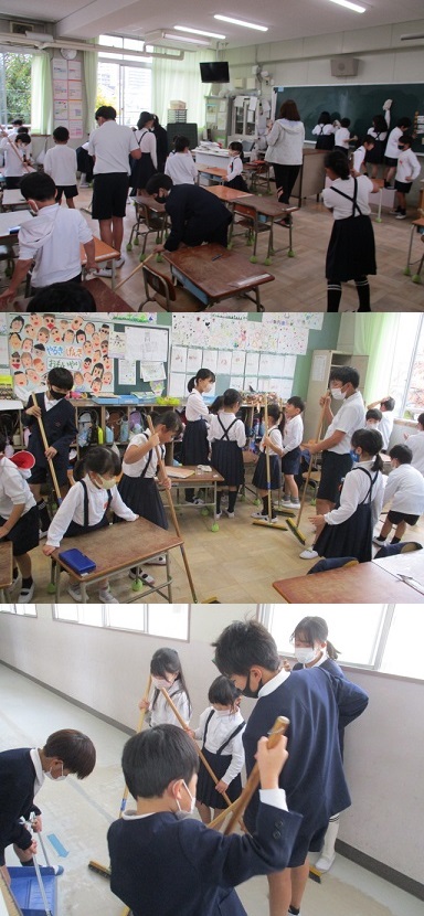 机を運んだり、黒板をきれいにしたり、教室や廊下の床をほうきで掃いてごみを集めたりしていました。