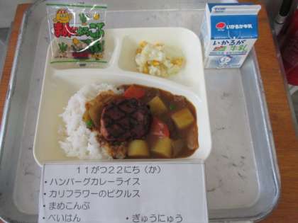 本日は、ハンバーグカレーライスです!焼き目のついたハンバーグをのせていただきます。給食室では、「何これ!ハンバーグやん!!」「初メニューや!!」児童も先生も大喜びでした。明日は、祝日、勤労感謝の日です。ゆっくり休んで、また木曜日元気な顔で会いましょうね。