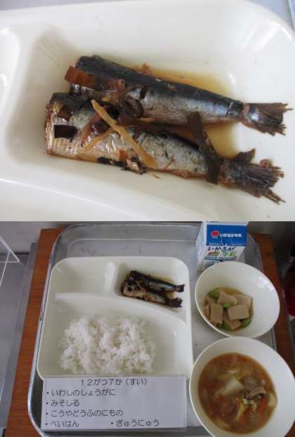 本日のいわしのしょうが煮です。千葉県産の新鮮なマイワシです。いわしをミニバットに入れ、こんぶ、調味液、しょうがを加え焼き物機で煮ます。マイワシは、体の側面に黒い斑点が七つくらいあるので別名「七つ星」とも呼ばれています。