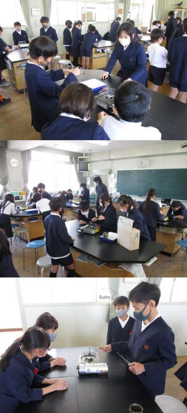 4年生は今までに、空気や水を温めたり冷やしたりしたときの体積の変化を調べています。空気や水は温かいお湯を使いましたが、今日の金属はコンロで熱しました。