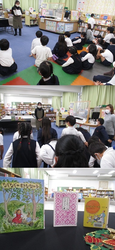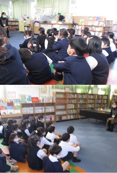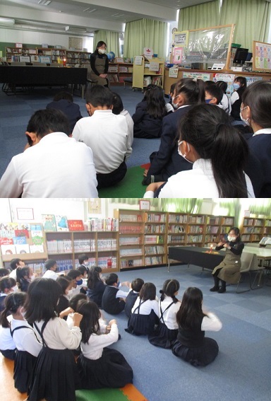 12月9日(金)2年生が読書の会をしていました。学校司書の先生から本の紹介や読み聞かせをしてもらいました。子どもたちは、お話の世界に入り込んで、お話が終わると自然に拍手が起こりました。お話とお話の間に、アイスブレイクで指遊びも楽しみました。