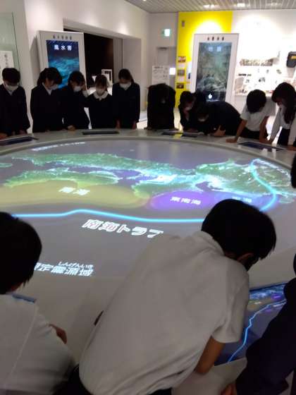 1組と2組に分かれ、震度7の揺れを体験したあと、地図を見ながら南海トラフ地震が起きたときの被害の状況の説明を聞きました。