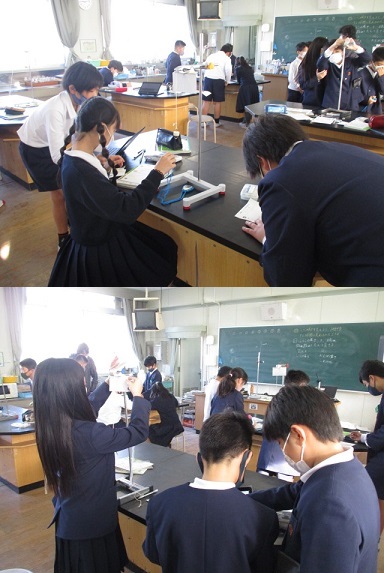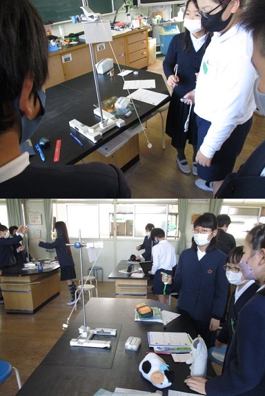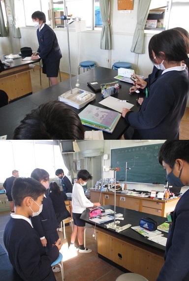 12月14日(水)5年生が理科の時間に、ふりこの長さがちがうと振れる時間(周期)がちがうのかを調べる実験をしていました。