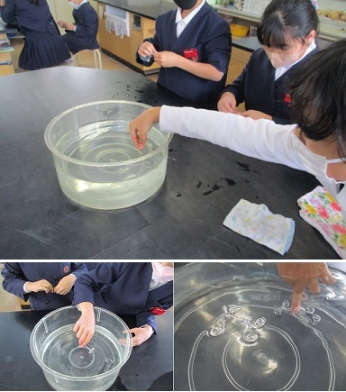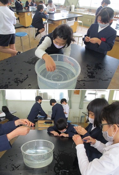 4年生が理科の時間、アメンボが水に浮く仕組みをもとに、アルミの針金で作ったアメンボ型のものを水に浮かせることに挑戦していました。