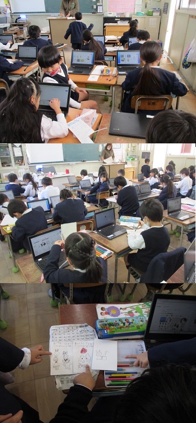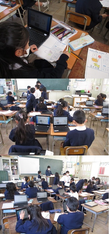 来年の干支の「うさぎ」のデザインを学習者用端末を使って探し出し、それを年賀状の台紙に描いていました。