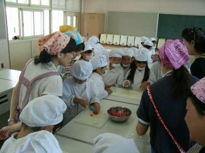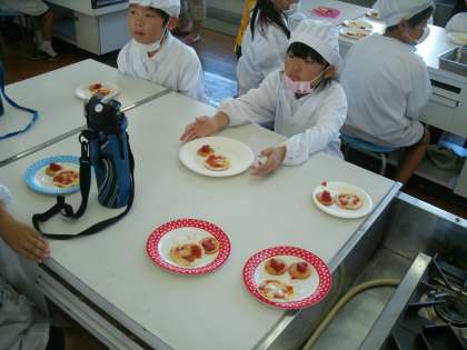 生活科で育てたトマトを使って、「トマトソース」「トマトジャム」を作りました。保護者の方にも手伝っていただき、クッキングを楽しみました。餃子の皮にソースを塗ってピザ風にし、ジャムはクラッカーにのせて食べました。
