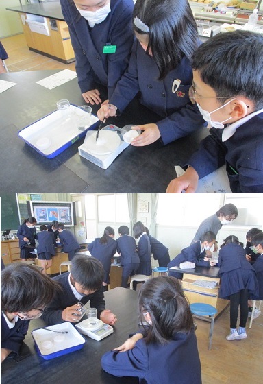 「水に食塩を溶かすとその重さはどうなるのか」という課題で、まず食塩の重さ・水の重さを測り、次に水に溶かした後の食塩水の重さを測って比べていました。