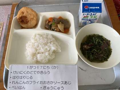 本日の給食は、学校給食献立コンクール最優秀作品です。平野中学校の昨年の給食委員会のみなさんが考えた献立です!「鶏肉の土手焼き、はりはり汁、れんこんのフライ大阪ソース味」です。大阪の郷土食をみんなで持ちより、大阪定食を考えたそうです。みんな「美味しかったー!」と大変、喜んでいました!