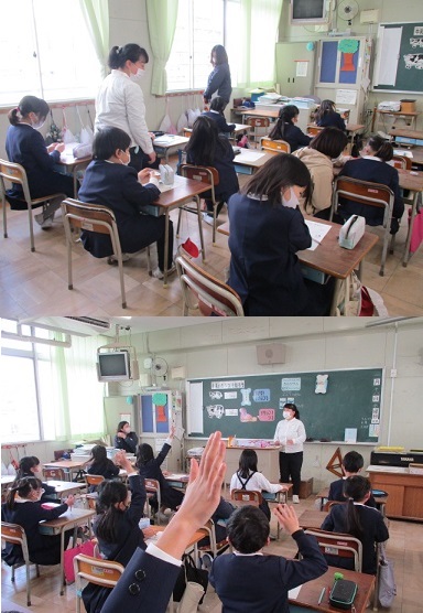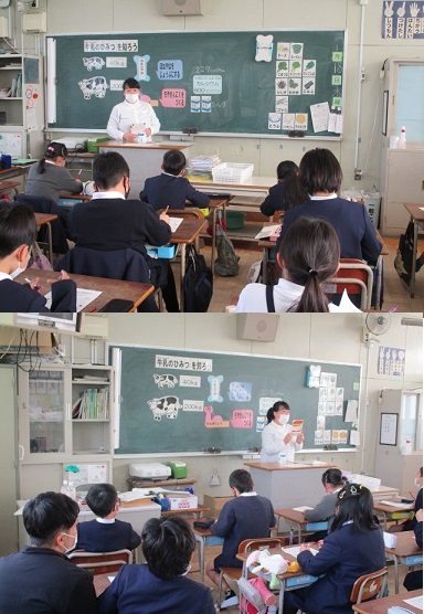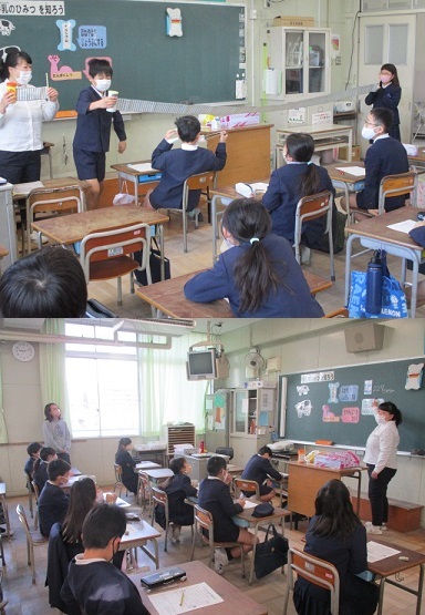 3年生が食に関する指導の時間に、「牛乳のひみつを知ろう」というテーマで栄養職員の先生と学習していました。