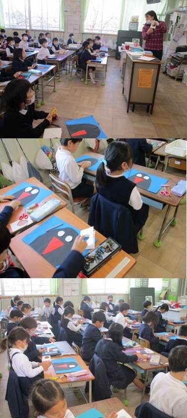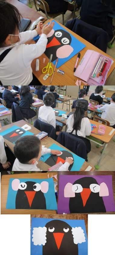 1年生が図画工作科の時間に、「おしゃれなペンギン」を作っていました。