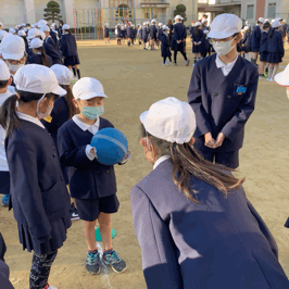 ひめっ子班(たてわり班)ごとに円形になり、集会委員児童より出されたお題に、一人ずつが答えてボールを隣りの人に回していくゲームです。お題は「冬といえば」「お鍋に入れる具材は」「おせち料理にはいっているのは」などでした。太鼓が鳴った時にボールを持っている子がお正月に何をしたかを答えていました。