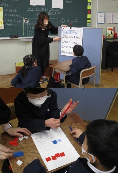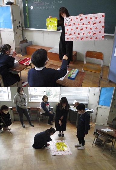 「ひろさのくらべかたをかんがえよう」というめあてで、シートの広さを比べたり、陣取りゲームをしたりして、広さのちがいを学びました。