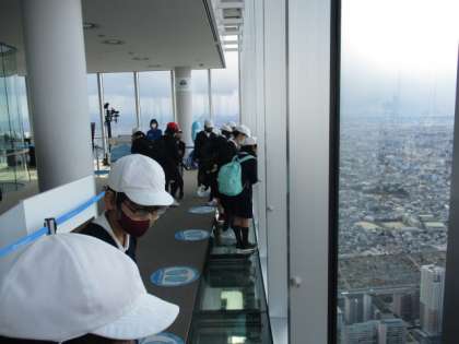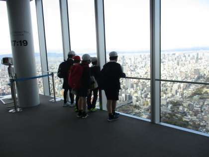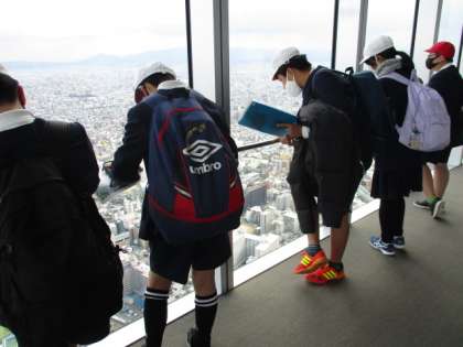 あべのハルカスからは、素晴らしい景色が見られました。子どもたちは、グループに分かれて活動しました。東西南北それぞれの方角に見えるものを探して、ワークシートに書いていました。