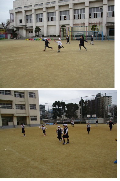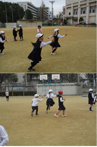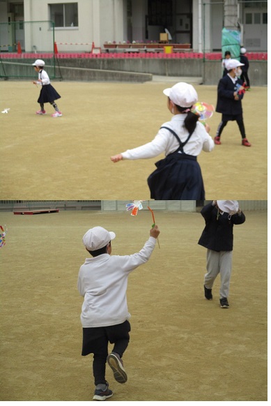 1年生が「ふゆをたのしもう」の単元でかざぐるまを作り、校庭で走ってかざぐるまを回しました。手作りのかざぐるまは、走るスピードに合わせて、クルクルとよく回っていました。思い思いの方向に楽しそうに走っていました。