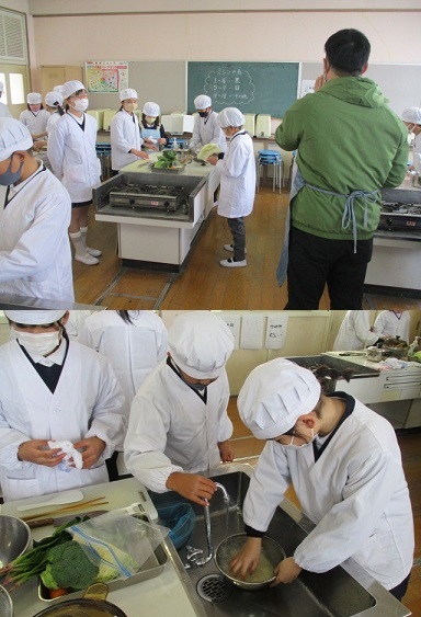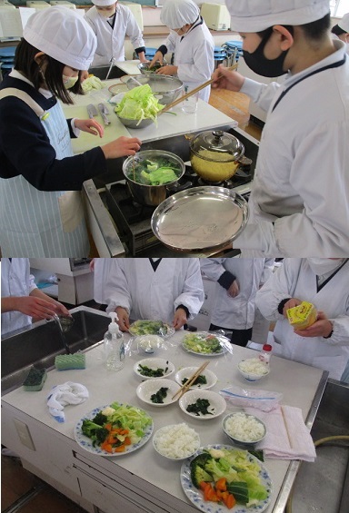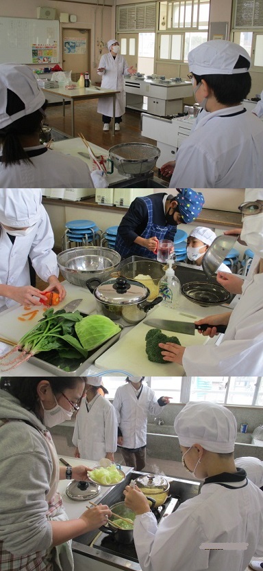 班ごとに調理の流れを確認しながら、協力して野菜を切ったりゆでたり、味付けをしたりして、上手に作っていました。