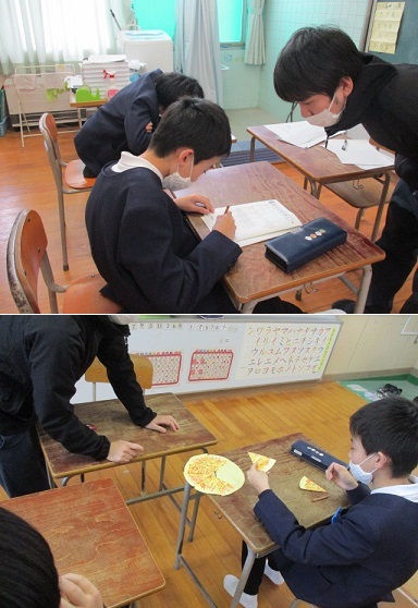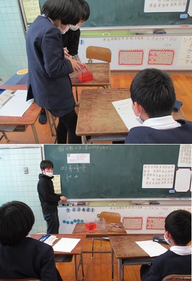 算数科の時間、みどり学級で「分数のたし算」の学習に取り組んでいました。