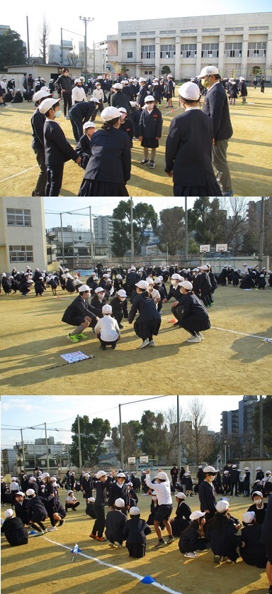 スマイル班で輪になり、集会委員会の児童が言う「チッチッチッチ・バリチッチ」のリズムに合わせて、班の子が立ち座りを繰り返します。最後の「バリチッチ」で立つ子を決め、集会委員会の児童が言う数と立っている子の数を一致させるというゲームです。