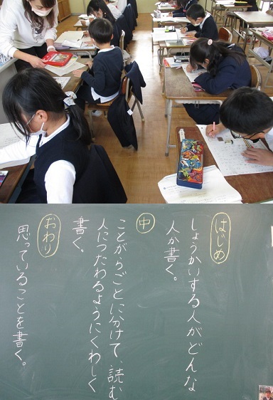 自分の紹介したい人を決め、だれに、どのように伝えるかを考えます。伝える内容を整理し、「はじめ・なか・おわり」のまとまりを意識して文章と絵で表していきます。