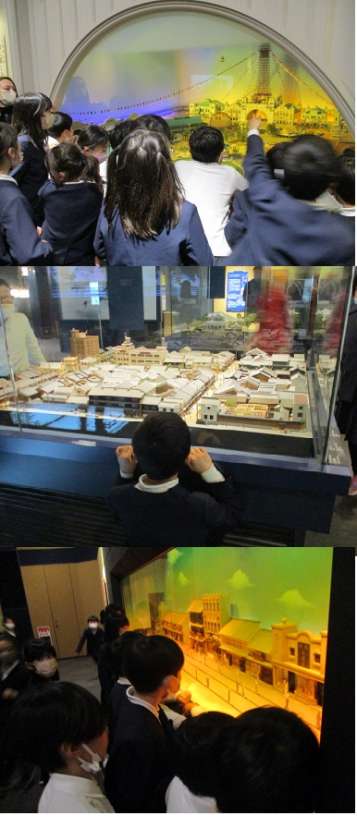 体験教室のあとは、展示室で江戸時代の大坂の街並みを体験したり、明治・大正・昭和の大阪のまち、住まいと暮らしを見学したりしました。企画展も楽しみました。