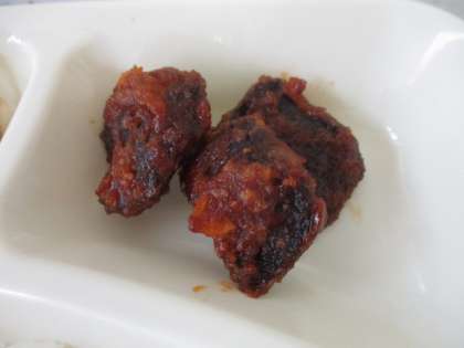 久しぶりに「くじらのオーロラ煮」です!しょうが汁、料理酒で下味をつけ、つけ汁を切り、熱したなたね油であげます。ケチャップ、砂糖、赤みそを合わせて煮、配缶時にからませます。