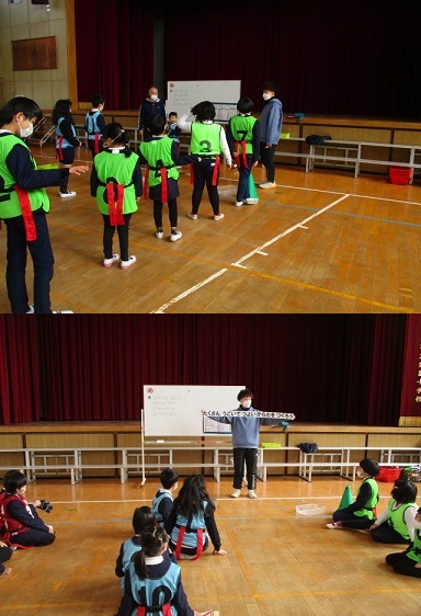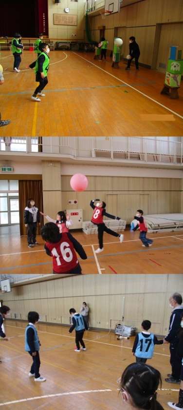 次に班遊びで、「的あて」「風船バレー」「大なわ」をコーナーごとに分かれ、ローテーションで楽しみました。