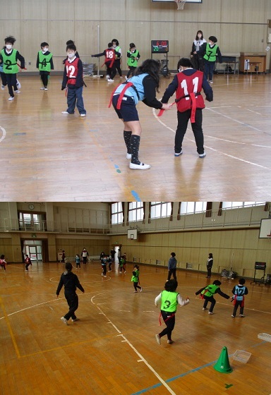 「たくさんうごいて つよいからだをつくろう」のめあてのもと、3つのグループに分かれ、まずはみんな遊びで、「しっぽとり」を行いました。2本ずつ腰に付けた紐を取り合うゲームですが、ほかの子に取られないように動き回る子もいました。