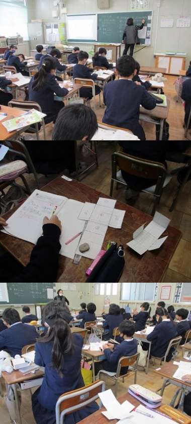 2月17日(金)4年生が算数科の時間、「平行な面 垂直な面」について学習していました。紙で作ったはこや教室の中にあるものを使って、平行な面や垂直な面を調べていました。