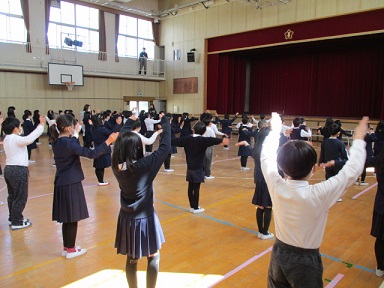 3年生が講堂で、3/2に行う卒業を祝う会の練習をしていました。