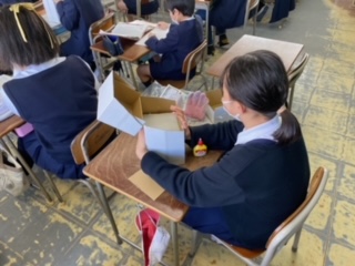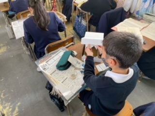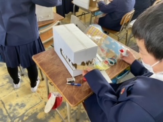 4年生がダンボールを使って工夫をこらしたボックスを作っていました。
