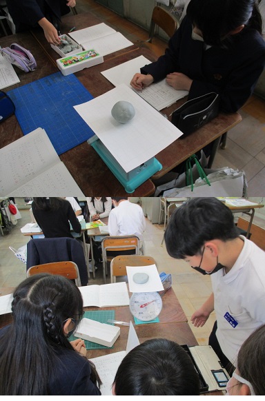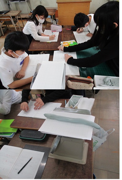 初めに粘土で200gの丸いたまを作ります。そのあと粘土の形を平らな形、細長い形、細かく分ける、さいころの形と変えていき、重さがどうなるかを調べました。はかりを正しく使って、班で協力して調べることができました。
