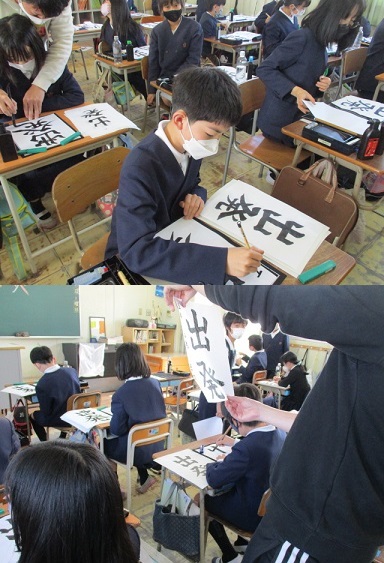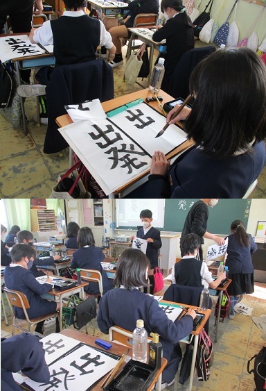5年生が書写の学習で「出発」という字を毛筆で書いていました。
