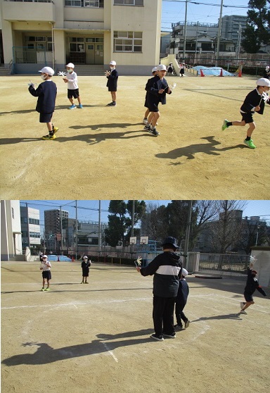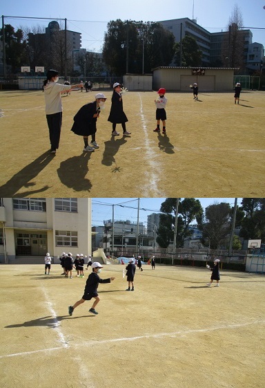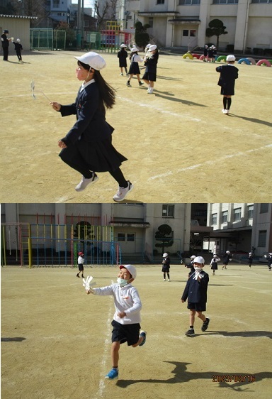 3月16日(木)1年生が生活科の時間に作った風車を運動場で回していました。