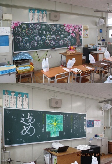 朝登校してきた6年生は、教室の黒板に描かれた絵やメッセージに驚いたことでしょう。