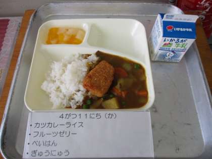 本日のメニューは、サクサクの一口トンカツがのったカツカレーライスとフルーツゼリーです。フルーツゼリーは、みかんゼリーと和なし(カット缶)でプルンと爽やかです♪