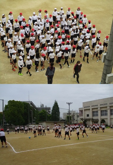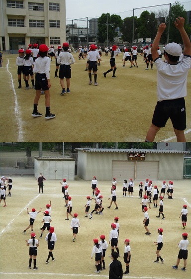 5年生が体育科の時間に、運動場でいろいろな運動をしていました。