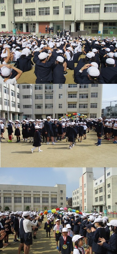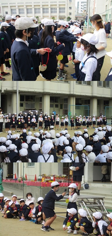 その後、6年生から1年生にメダルのプレゼントを渡し、1年生へのインタビューや学校に関する○×クイズがありました。
