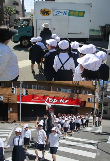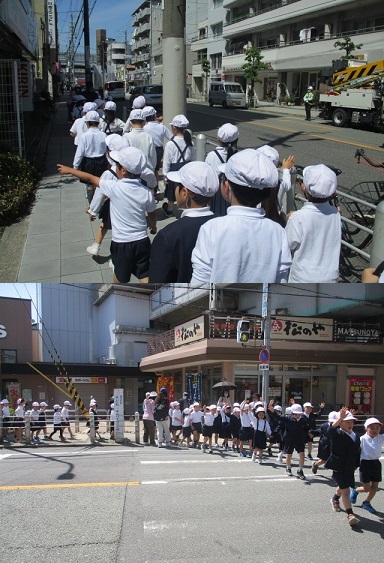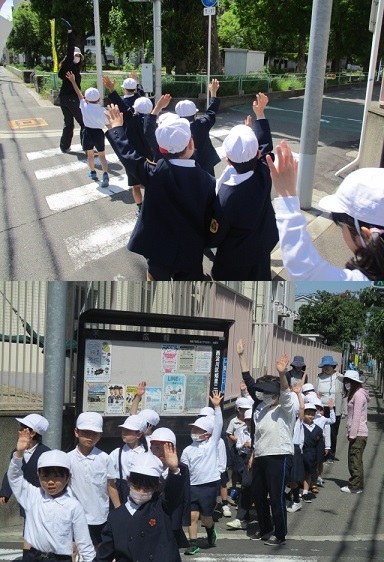 遠足や校外学習をひかえ、安全に気をつけ、横断歩道の渡り方や信号の見方など、先生から教わりながらクラスごとの集団で歩行しました。