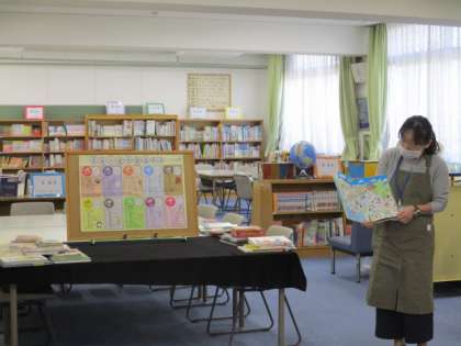 日本十進分類表に基づいて図書室の本に数字をつけ、本を探しやすくなっていることなどを学校司書の方に教えていただきました。