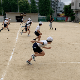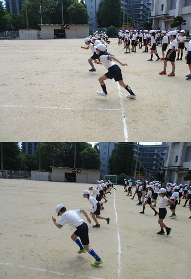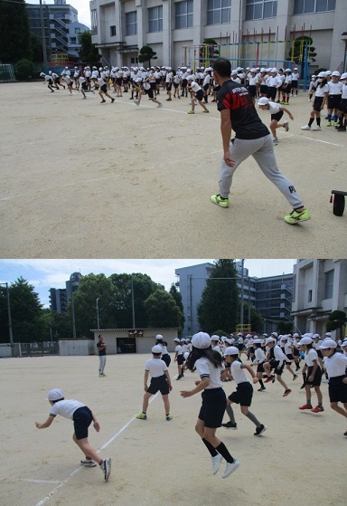 5月15日(月)出前授業で西淀中学校の体育の先生に来ていただき、5年生が50m走のよりよい走り方を教わりました。