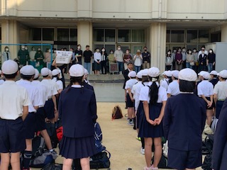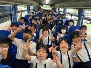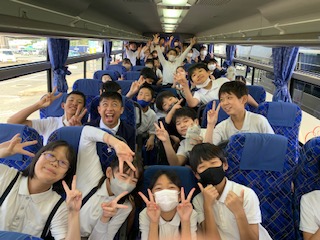 5月17日(水)6年生が修学旅行に出発しました。出発式で保護者の方々に「行ってきます」の挨拶をして、バスに乗りました。バスの中の様子です。渋滞もなく、みんな元気そうです。