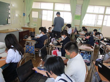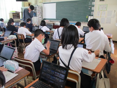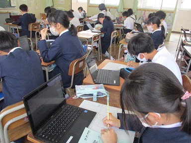 学習者用端末を使って、インターネットで資料を調べ、新聞の記事に活用していました。