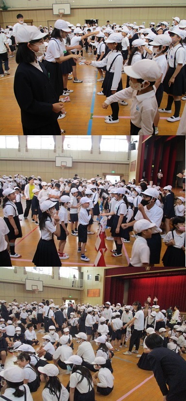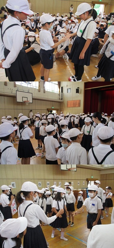 集会の内容は「かちぬきジャンケンゲーム」です。ルールは、ひめっ子班(たてわり班)ごとに1列に並び、先頭の班長と向かい合い、ジャンケンをして、勝てば班長の後ろに並び、あいこや負けると列の最後尾に回り、再度ジャンケンを繰り返し、勝つまで行います。班の全員が班長の後ろに並ぶと終了です。