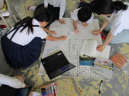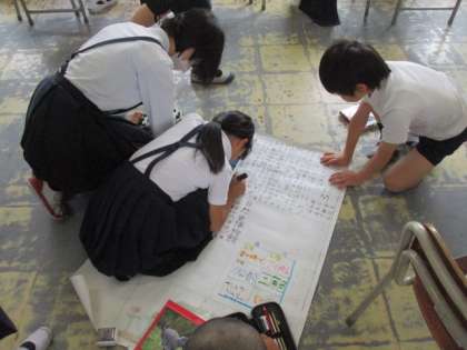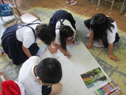 4年生が新聞を作っています。春の遠足やクラスで取ったアンケートなど、記事を分担して書いていきます。遠足の写真を貼ったり絵をかいたり色を塗ったりして、班ごとに工夫していました。