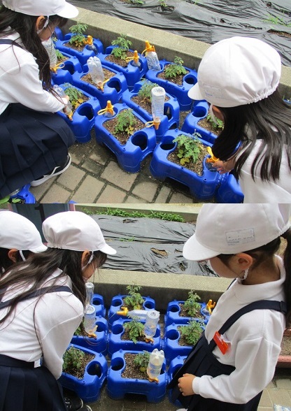 1年生や2年生が学習園の近くに置いたアサガオやミニトマトの水やりをしていました。