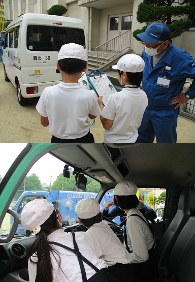 4年生が社会科の学習で、西北環境事業センターの職員の方に来ていただき、「パッカー車体験」をしました。
